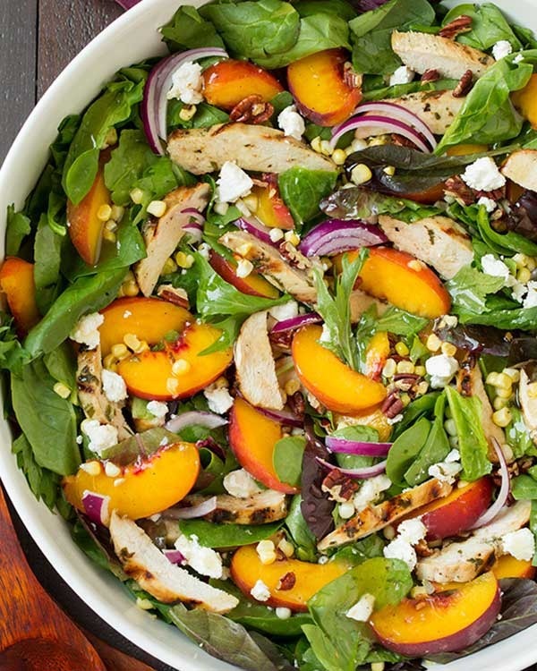 Pfirsichsalat mit gegrilltem Basilikum-Hühner- und Weißbalsamik-Honig-Vinaigrette