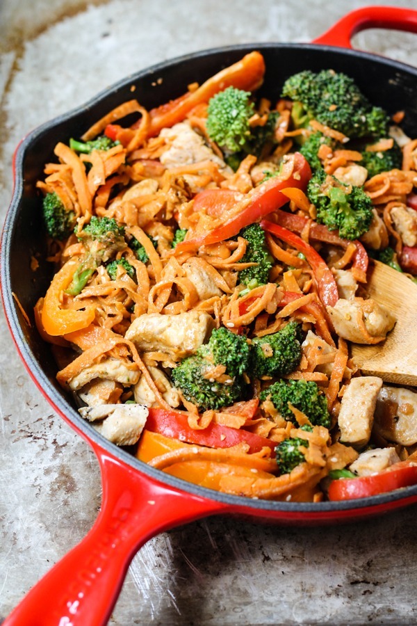 Dieses schnelles, gesundes Abendessen ist eine Kombination von unvergesslichen Aromen. Süße Kartoffelnudeln sind ein leichtes zu Hausecarb swap. Für die fettigen Nudeln, die Sie am Takeout-Platz um die Ecke servieren würden. Sie werden Ihnen mehr Ernährungsvorteile geben und dem Teller eine schöne Textur hinzufügen.