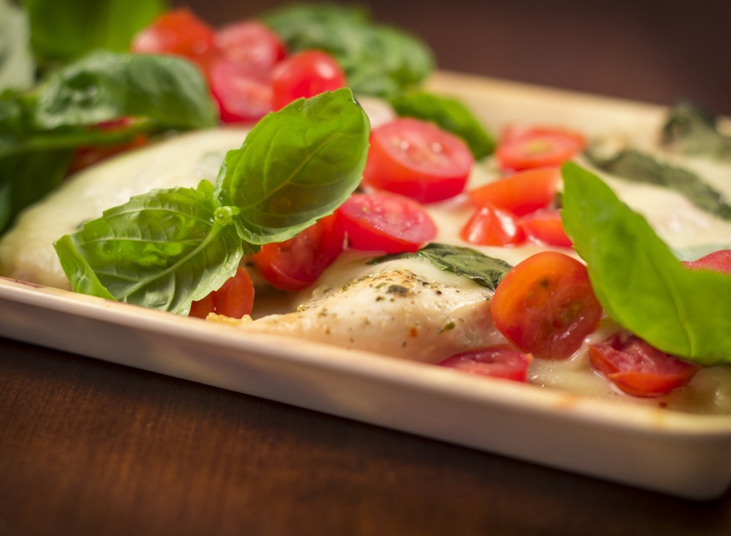 Was du brauchen wirst: Dünne Hähnchenbrust, zwei gehackte Knoblauchzehen, gehackte Erbstück-Tomate, gehackter Basilikum, gehackter frischer Mozzarella, Balsamico-Essig, Olivenöl, Zucchini, gelber Squash, Knoblauchpulver, Salz, Boden schwarzer Pfeffer