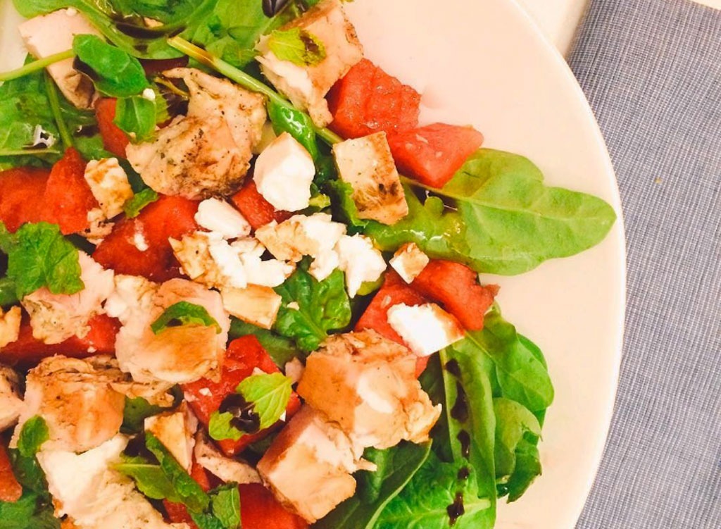 Was du brauchen wirst: Würfelwassermelone, geschnittenes gegrilltes Hähnchen, zerbröckelte Feta, Grüns, Balsamico-Essig, Olivenöl