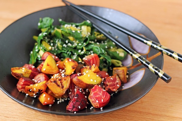 Ernährung: 205 Kalorien, 10,6 Fett (1,5 g gesättigtes Fett), 465 mg Natrium, 25,5 g Kohlenhydrate, 4,4 g Faser, 12,9 g Zucker, 4,8 g Protein (berechnet mit 6 Rüben, 8 Unzen Kohl, 1 Esslöffel Braggs flüssige Aminos und ohne Salz oder Sesamsamen)