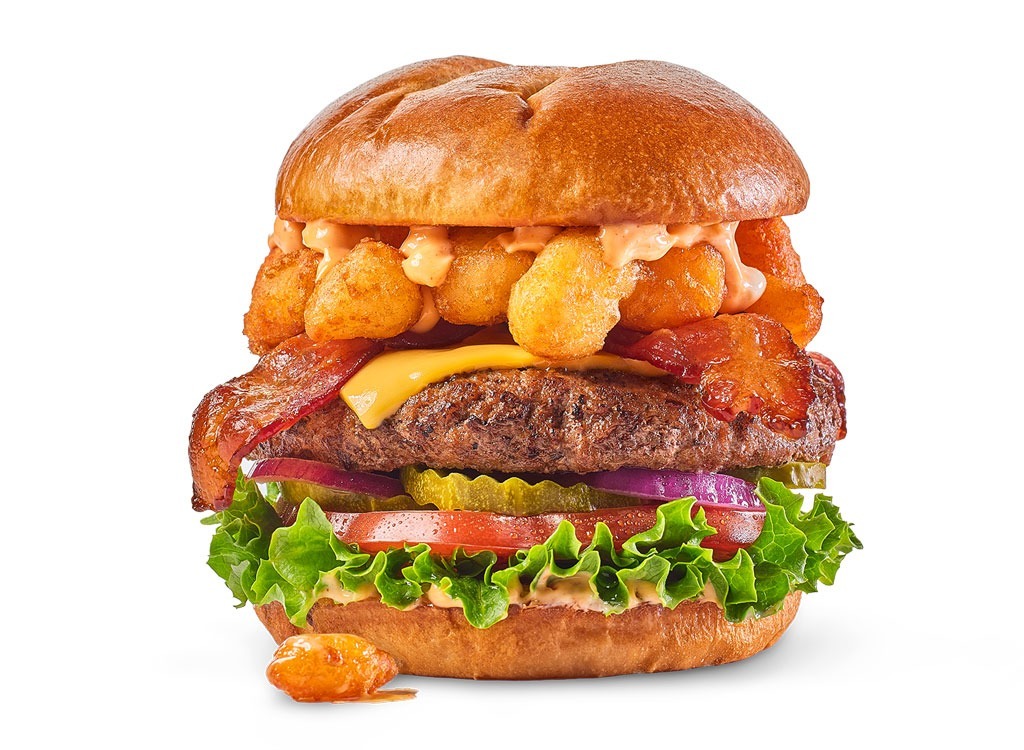 Geeignet nimmt zwei USDA Wahl Burger Pasteten und erstickt sie in einem Zucker beladenen Honig BBQ Sauce (mit der Sie 60% Ihrer DV von zugesetztem Zucker erreichen), geschmolzen Cheddar-Käse, knusprig gebratenen Zwiebeln Saiten, schattiert-geräucherter Speck und Ranch Dressing .