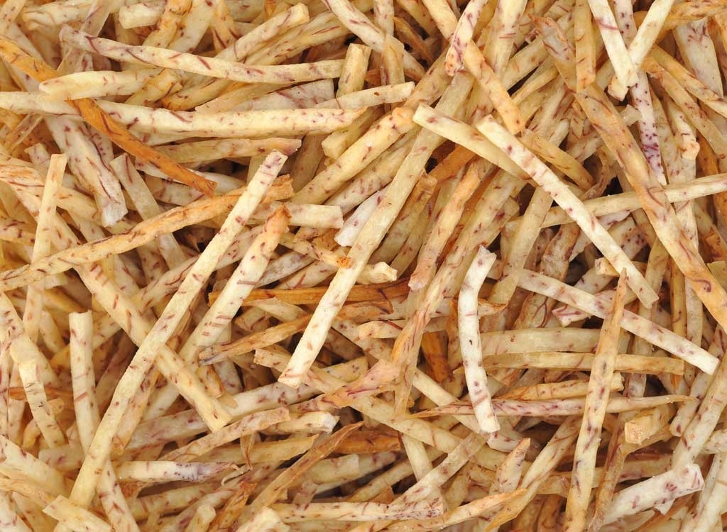 Dünn geschnitten und dann gebacken, ist Taro auch eine großartige Alternative zu Ihrem DurchschnittKartoffelchips. Mit mehr Faser und weit weniger Kalorien als alles, was Sie in einer Tasche bekommen würden, sind Taro-Chips eine großartige Wahl für einen Snack, den die ganze Familie lieben wird. Die Marke Terra hat bereits gefangen und hat ihre eigene Vielfalt von Taro-Chips.