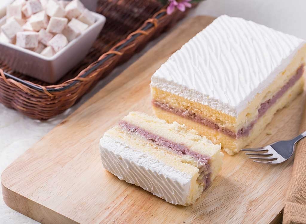 Dasselbe Taro-Pulver, mit dem Bubble Tee verwendet werden, kann tatsächlich gekauft und zum Geschmack verwendet werden - und fügen Sie eine Vielzahl von Backwaren hinzu. Sie können auch Taro Mehl verwenden, der glutenfrei ist! -Instead des regulären Mehls. Und wir können an nichts denken, dass Kinder mehr lieben würden als ein großes Stück lila Kuchen!