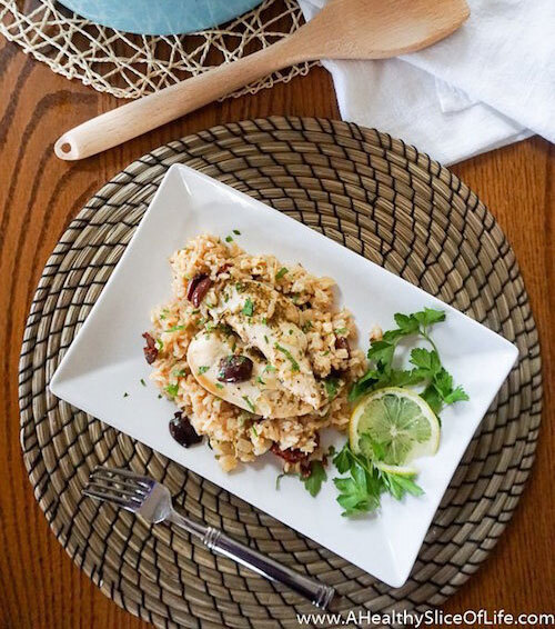 Dieses griechische Huhn mit Zitronenreis vonEin gesundes Stück Leben kann mit nur einem Topf hergestellt werden und dauert weniger als eine Stunde. Das leckere Gericht verwendet Feta, was großartig ist, wenn Sie Ihr Gewicht und Ihre reichen Kalamata-Oliven ansehen. Ein Biss dieser zestigen Mahlzeit und Sie fühlen sich wie Ihr Segeln im Mittelmeerraum.