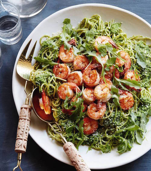 Arugula Pesto Pasta mit Knoblauchgarnelen