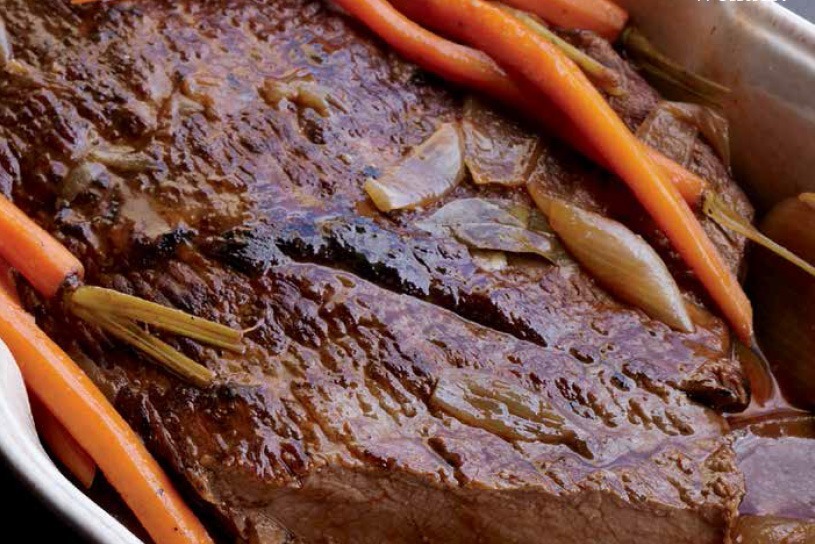 - Entfernen Sie das BRISKET vom Kocher und schneiden Sie ihn in dünne Stücke. Verwerfen Sie die Bucht verlässt. Servieren Sie das BRISKET in einer flachen, breiten Schüssel mit Zwiebeln, Karotten und ein bisschen Brühe, das über die Oberseite gegossen wurde. Garnieren Sie jeden mit einer Schaufel von Meerrettichcreme.