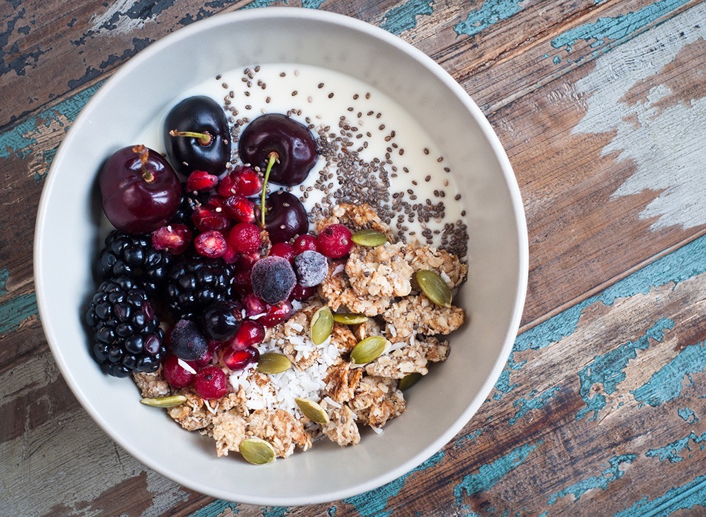 Nach ein wenig Dehnung oder ein paar leichte Calisthenics bin ich bereit zum Frühstück. Meistens habe ich, was ich die Kraftschüssel nenne, eine normal große Schüssel, die ich mit einer Mischung aus fülle: