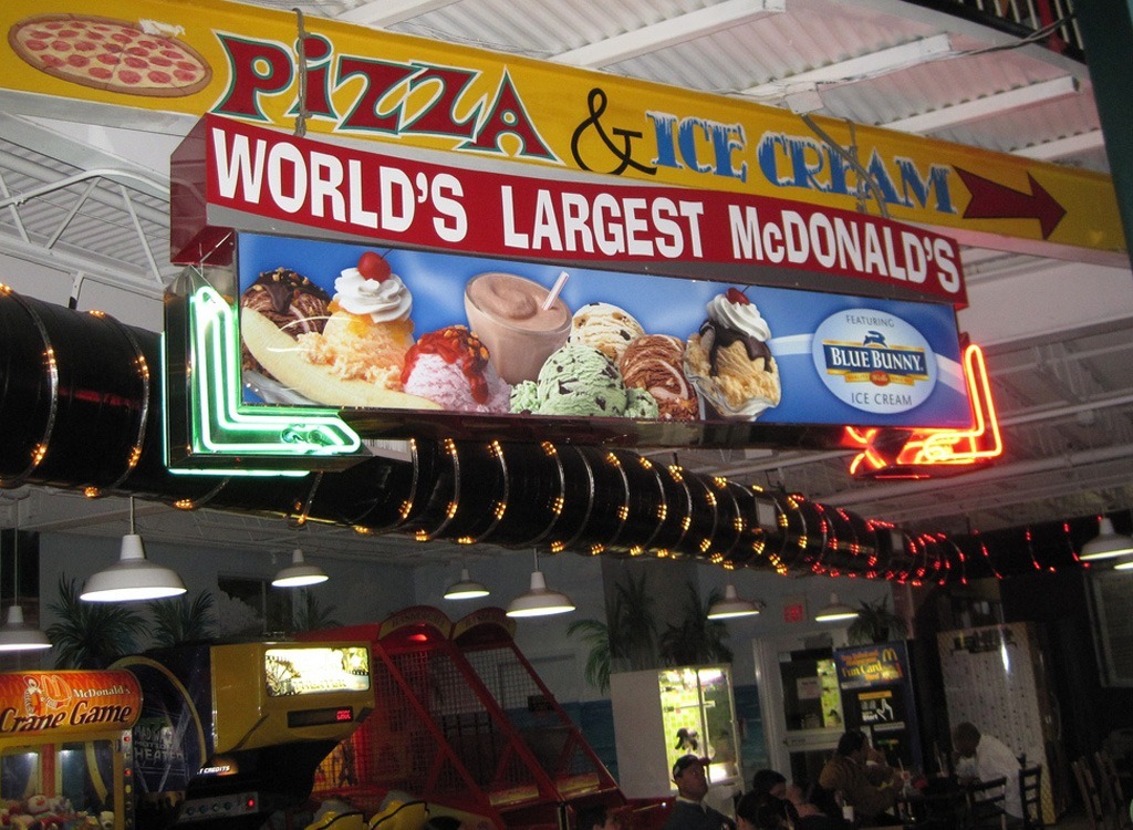 Orlando, Heimat der Universalstudios undDisney WorldDann hat auch die neu umgebenden "weltweit größten Unterhaltung McDonald's" ihre Wurzeln. Nach etwa einem Jahr geschlossen, ist die 24-Stunden-McDonald's zurückgekehrt im Geschäft mit "Erstellen Sie Ihre eigenen" Burger, Hühnchen-Sandwiches, Pizza, Teigwaren, Waffeln und Omelets. Mini Mickey D-Fans können auch sagen: "Ich liebe es zu einem 22-Fuß-Tall-Kinderspielplatz mit Rutschen und mehr als 50 Arcade-Spielen.
