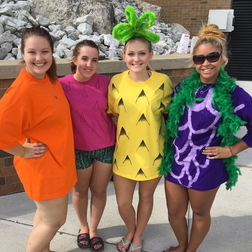 Sammeln Sie Ihre Freunde und werfen Sie ein köstliches Kostüm zusammen. Wir lieben diese Kombination von Orange, Wassermelone, Ananas und Trauben!