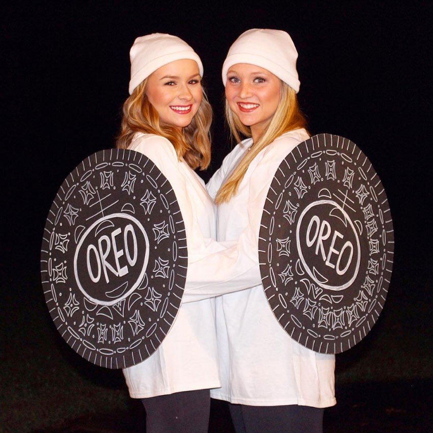Sie könnten eines der30 schlimmste Supermarktplätzchen in Amerika, aber sie machen sicherlich ein cleveres Halloween-Kostüm! Sie und Ihre andere Hälfte brauchen ein weißes langärmeliges T-Shirt und einen Hut. Schneiden Sie zwei identische Kreise aus schwarzen Posterplatinen aus und verwenden Sie einen weißen permanenten Marker, um das klassische Oreo-Muster (oder schreiben Sie einfach "OREO", wenn Sie weniger kreativ geneigt sind). Binden Sie einen Knoten am Ende von vier Längen des weißen Bandes, Löcher in der Posterplatte und Fadenband durch, um sich ein paar Riemen zu machen.
