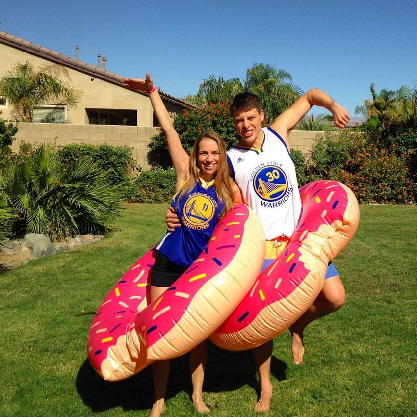 Schnappen Sie sich Ihr Lieblings-Jersey des NBA-Teams, ein aufblasbares Röhrchen, einen Basketball, einige Schweißbänder und einen Kumpel (es ist Dunkin)DonutsNach allem, um dieses super einfache Kostüm abzuschließen.