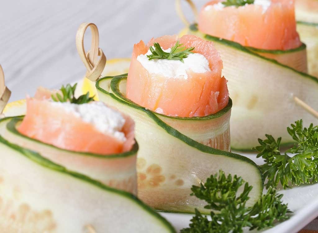 Eine andere Möglichkeit, Ihre Füllung von Omega-3s zu füllen, besteht darin, einige Gurkenscheiben zu schneiden, die als "Brot" dienen, und sie mit geräucherten Lachs und Sprossen aufdecken. Bonus: Fettfische ist einer derBeste Lebensmittel für Menopause.