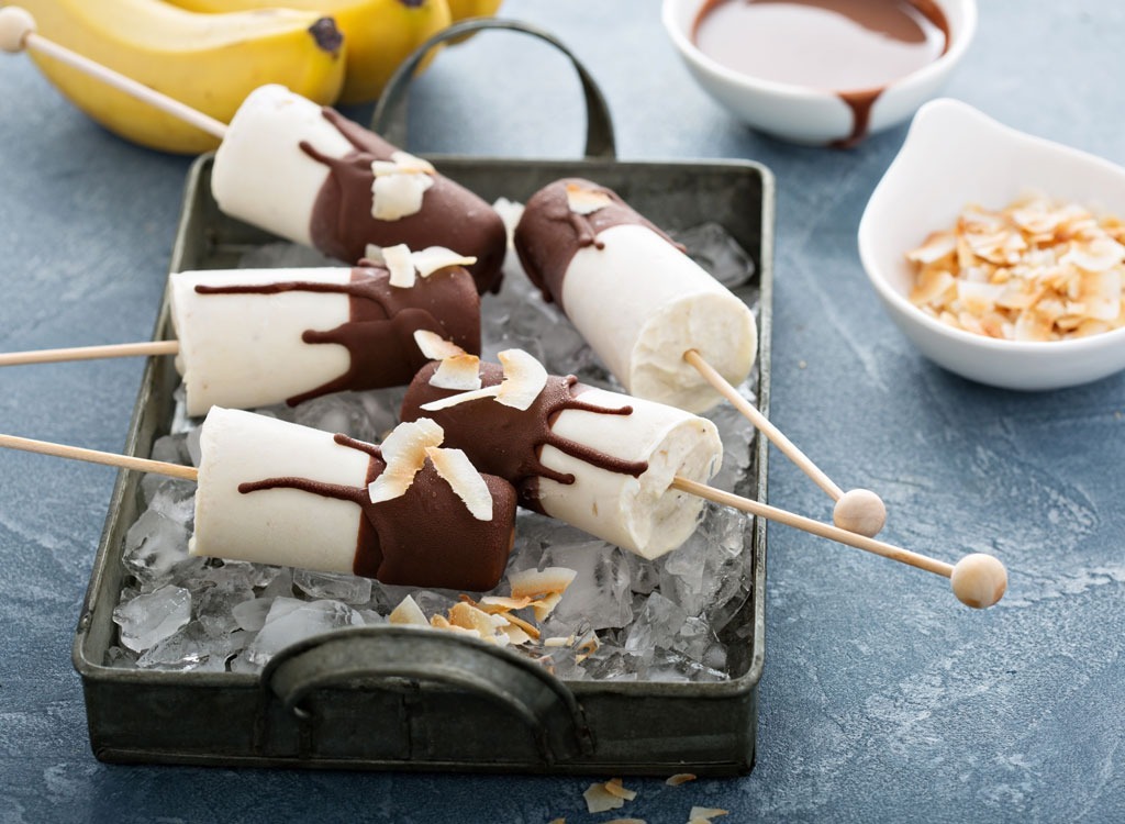 Laut Tom enthält Bananen eine präbiotische Faser, die als resistente Stärke bezeichnet wird, um gute Bakterien im Darm zu füttern. "Studien haben gezeigt, dass ein gesundes Mikrobiom mit besserer Stimmung verbunden ist, so dass frohende Bakterien Sie auch glücklich machen!" Sie empfiehlt, eine Banane in Joghurt zu rollen (idealerweise fettfreies Griechisch oder so etwas ohne zusätzlichen Zucker) und gehacktem Muttern mischen und dann einfrieren. Nächstes Hacken Sie die Banane auf und schichten Sie es auf Toast- oder Faser-Cracker mit einer dünnen Mandelbutterschicht. Yum-and spaß!