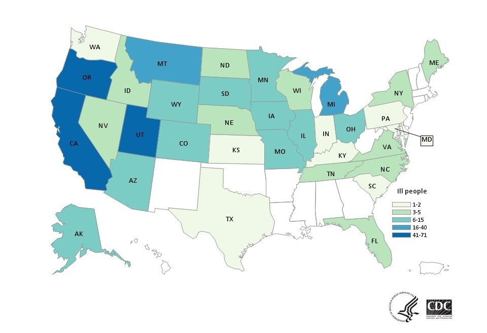 Wie Sie sehen, haben Sie in der nachstehenden Karte (zur Verfügung gestellt von der CDC), Kalifornien, Oregon und Nevada, in den meisten Fällen, die sich auf die Thomson-produzierten Zwiebeln zusammenhängen, gemeldet. Nördliche Mittlere und westliche Staaten wie Michigan und Montana haben auch eine alarmierende Anzahl von Fällen gemeldet.