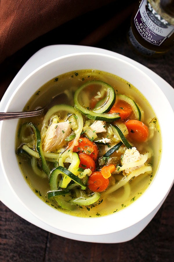 DiesSuppebietet viel Eiweiß für sehr wenige Kalorien. Die Zoodles (Zucchini-Nudeln) sind eine gesunde Alternative zu Nudeln, die Sie in einem Ihrer Lieblingsrezepte ersetzen können. Dieses Gericht ist in Natrium etwas hoch, aber es hat mehr als die täglich empfohlene Einnahme von Vitamin A und fast Ihre gesamte tägliche Menge Vitamin C, die ein starkes Immunsystem unterstützt. Der Apfelwein-Essig in diesem Rezept ist ein zusätzlicher Bonus - ideal, um Sie sättigen und den Gewichtsverlust zu steigern.