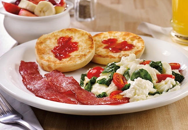 670 Kalorien, 11 g Fett (9 gesättigtes Fett), 3,087 mg Natrium, 103 g Kohlenhydrate (16 g Faser, 32 g Zucker), 33 g Protein (beinhaltet zwei Truthahn-Speck-Streifen, ein englisches Muffin und saisonale Früchte)