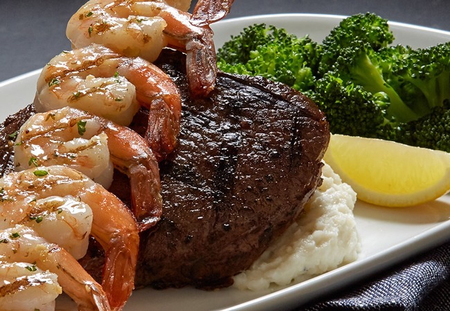 Roter Hummer "Leuchtturm" Wood-gegrilltes Pfeffercorn-Sirloin und Garnelen