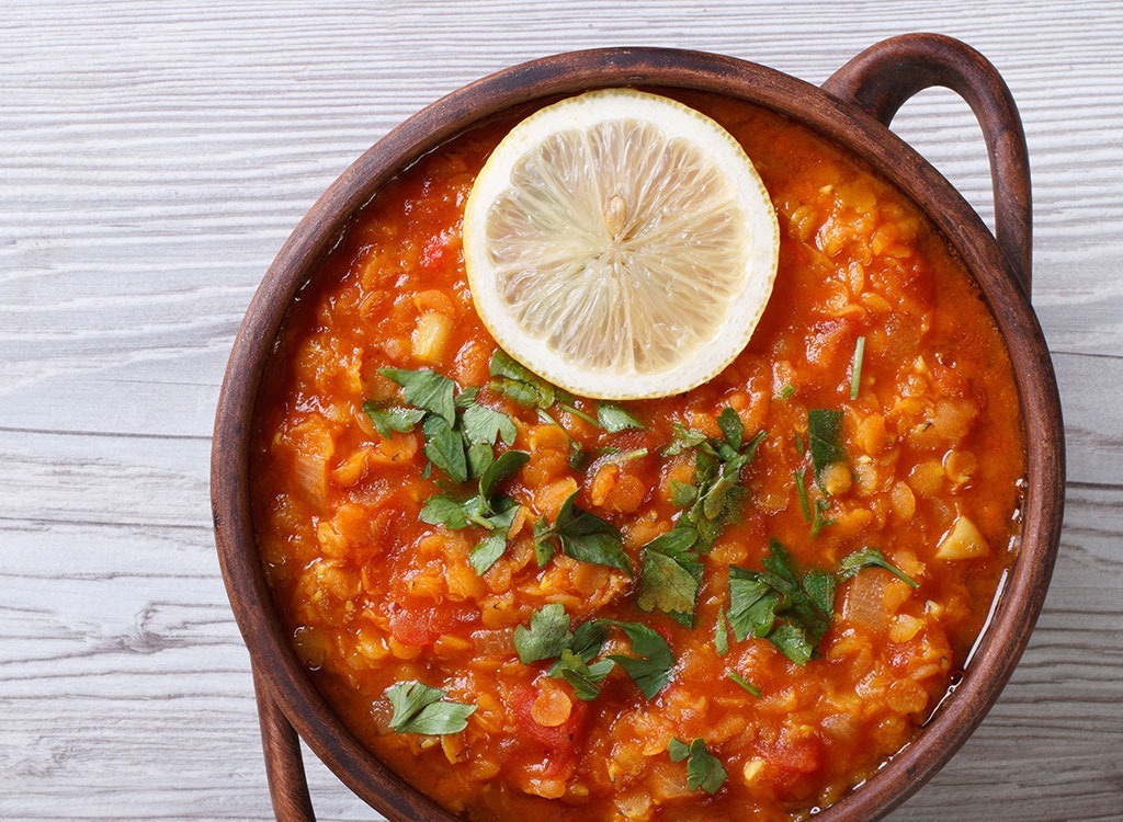 Durch das Ersetzen von Fleisch mit Lebensmitteln wie Bohnen oder Linsen senken Sie Ihre Ansaugung gesättigter Fett und Kalorien und erhöhen den Faserverbrauch, sagt Shapiro. "Zu oft essen wir mehr als die empfohlene Portionsgröße von 3 bis 4 Unzen Fleisch zu einer Mahlzeit - zusätzlich zu allen anderen Lebensmitteln auf unserem Teller - und die Kalorien summieren sich schnell", sagt sie. "Alles, was Fett und Eiweiß schwer zu verdauen ist, ist schwer zu verdauen und können Sie träge fühlen. Dies kann Ihre Aktivitätsniveau für den Rest des Tages verringern oder Ihre Entscheidung auf einen Snack auf einen zuckerhaltigen Artikel später beeinflussen." Für gesunde, sättigende Ideen für Fleischersatz, überprüfen Sie die29 Beste Proteine für den GewichtsverlustSchnitte