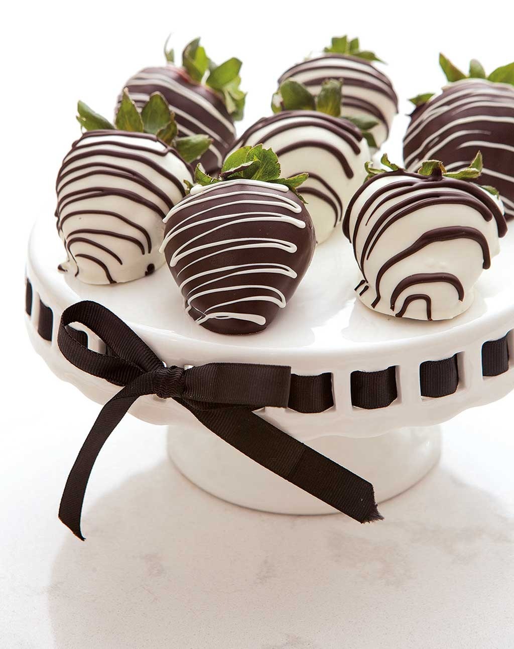 - Neige die geschmolzene weiße Schokolade hin und her über den Beeren. Wiederholen Sie mit den verbleibenden Beeren. Bevor die Schokoladenstufe eine Seite stillstehen, oder die spitzen Enden mit Puderzucker oder großer Kornzucker.