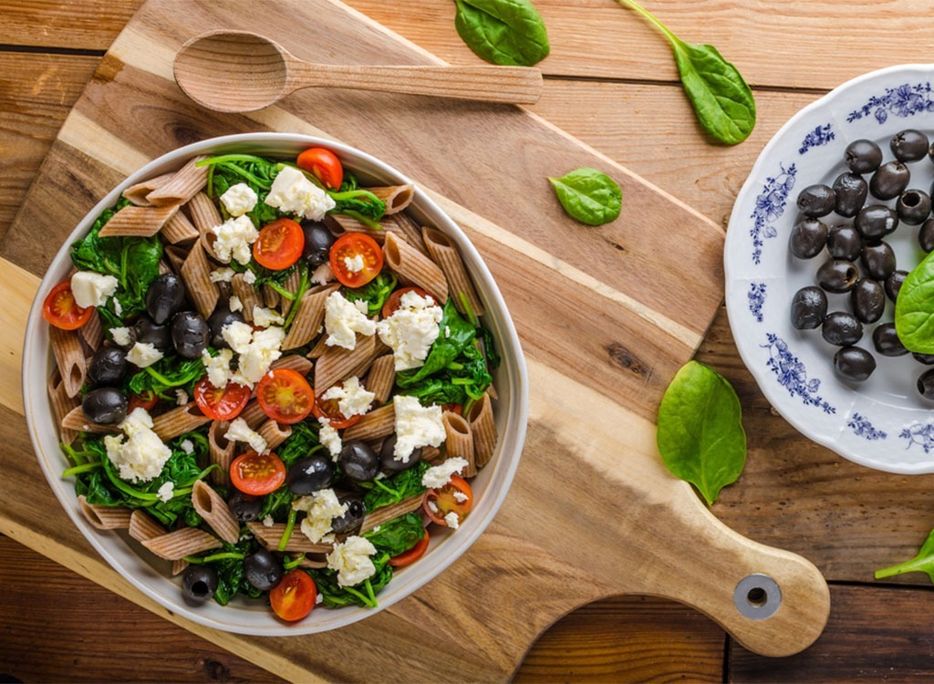 Was du brauchst: Vollkornnudeln, Feta-Käse, Spinat, Oliven, Tomaten, Balsamico, Olivenöl