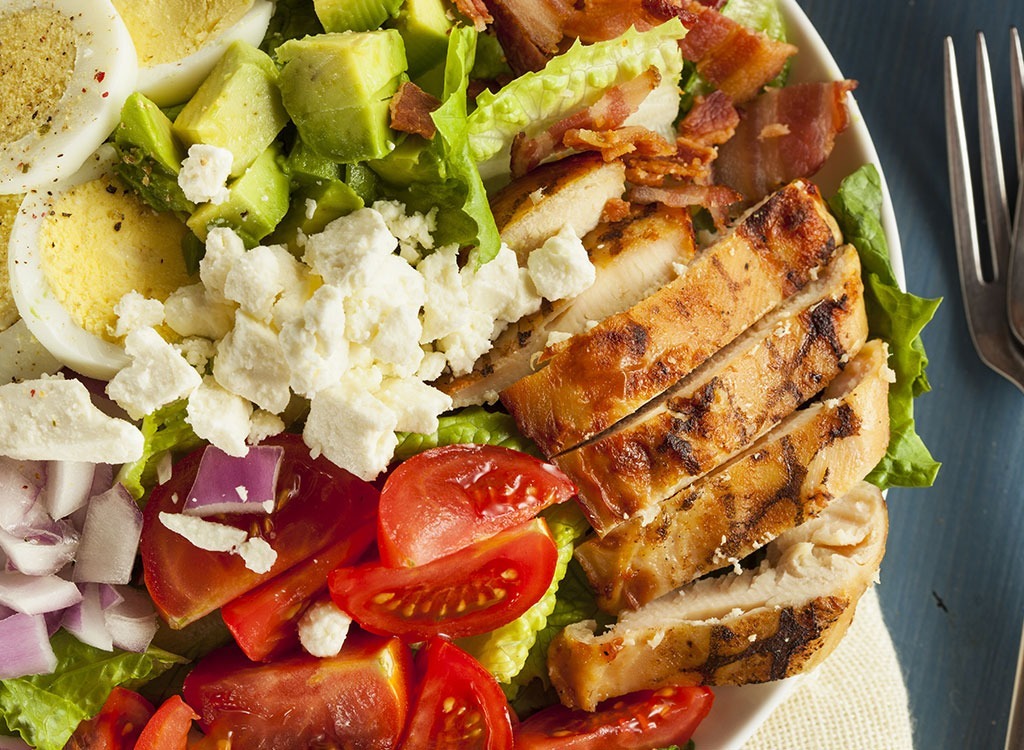Was du brauchst: Salat, hart gekochtes Ei, Tomate, Huhn, Speck, Avocado