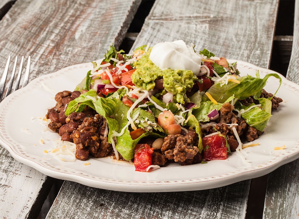 Es ist Zeit für Tacos, aber lassen Sie uns die Tortillas überspringen! Wenn Sie von der Peadover-Quinoa oder des Huhns von gestern Abendessen verbleiben, werfen Sie etwas mit gespülten schwarzen Bohnen, um die Proteinzählung zu steigern. Wenn Sie dabei sind, hacken Sie alle Ihre Lieblingsfüllungen, Tomaten, Avocado, Cilantro, Rote Zwiebeln und Salat, und mischen Sie es in einen Salat. Aber nehmen Sie einen Pass auf die erwartete Sauerrahmung. Wenn Sie wirklich etwas Cremigkeit in der Mischung brauchen, schmeckt ein Dollop des griechischen Joghurt genauso gut und hilft, Ihren Verdauungstrakt mit der großen Konzentration von zu heilenProbiotika.