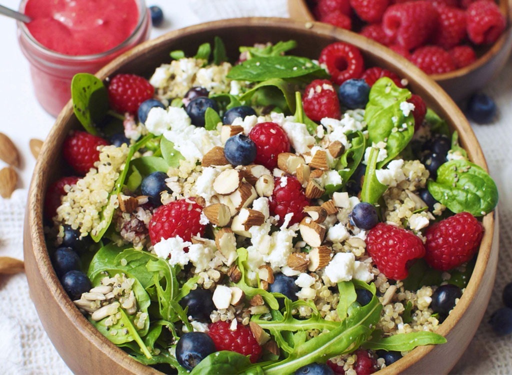 Lassen Sie sich nicht von der letzten Woche von diesem Quinoa abnehmen! Dieses Getreide ist in Eiweiß hoch und eignet sich hervorragend, um Ihre Ernährung hinzuzufügen, wenn Sie ein Vegetarier sind, insbesondere weil es ein Aminosäureprofil hat, das den tierischen Proteinen ähnlich ist. Ganz zu schweigen, dass seine knusprige Textur immer einen besseren Biss macht. Beeren, wie Blaubeeren und Erdbeeren, werden dank ihres Fasergehalts den Verdauungsprozess verlangsamen, was letztendlich länger fulsen lässt. Werfen Sie etwas Spinat und eine helle Mantel von Balsamico-Essig. Genau wie das haben Sie eine Schüssel mit Farbe, Faser und fantastischNährstoffe. Ganz zu schweigen von, wie appetitlich es sieht!