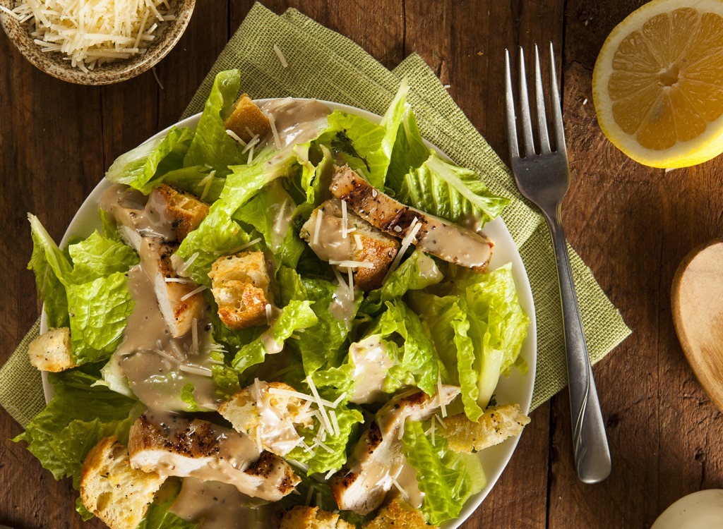 Der Caesar-Salat Wir sehen immer auf einem Menü, nicht so toll für Sie. (Ja, Salatesind nicht immer gesund. Wer wusste?) Aber indem Sie einige andere Grüns hinzufügen, und nicht nur mit wasserhebiger Romaine, können Sie Ihren Nährstoffgehalt steigern. Zum Beispiel fügt Broccoli einen zusätzlichen Crunch zum Salat hinzu, und es ist mit dem Bone-Stärken von Vitamin K und immune, um Vitamin C geladen Dieser einfache Schalter senkt die Kalorien und schleicht sich inProbiotika mit minimalem Aufwand. Halten Sie es auf der Seite und verwenden Sie es sparsam.
