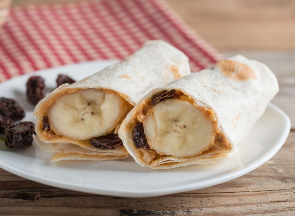 Verbreiten Sie Erdnussbutter entlang einer Seite von Fladenbrot. Besprühen Sie Chia-Samen oben. Legen Sie die gesamte Banane parallel zu einem schmalen Ende der Fladenbrot. Rollen Sie die Fladenbrot um die Banane auf und legen Sie die Nahtseite nach unten. Scheibenrolle in "Sushi" -Teile.