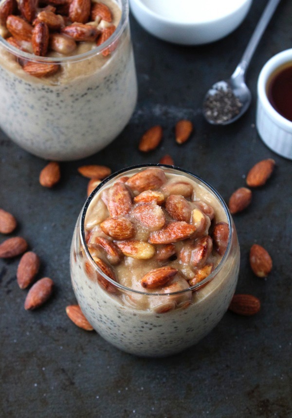 - Gießen Sie Karamell in eine Schüssel und fügen Sie Mandeln in die Schüssel hinzu. miteinander rühren und dann gleichmäßig überholt von Chia Pudding verteilen.