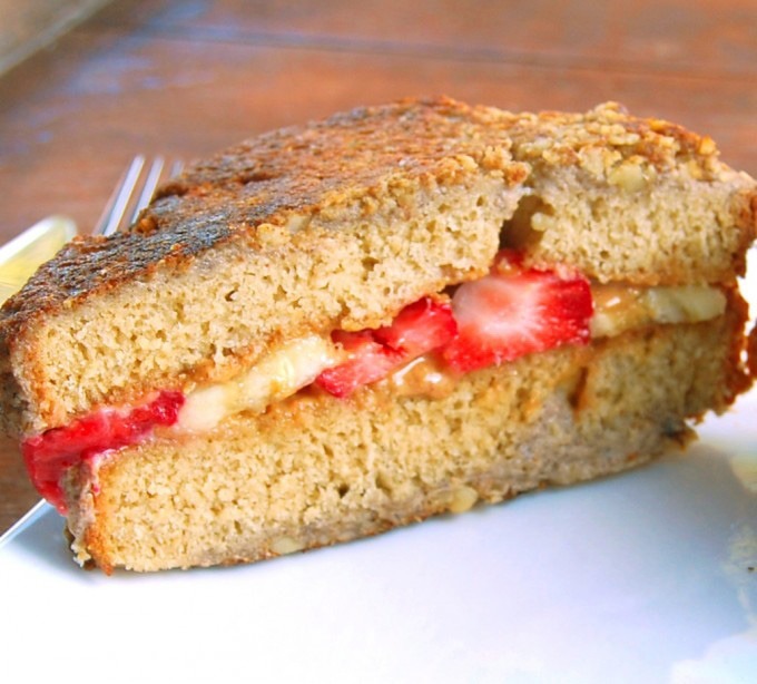 - Spreizen Sie etwas Erdnussbutter auf einer Seite jeder Scheibe. Ordnen Sie dann die geschnittenen Erdbeeren und Bananen auf der butterierten Seite an. Legen Sie die zweite Seite, Butterseiten unten nach unten und drücken Sie fest nach unten.