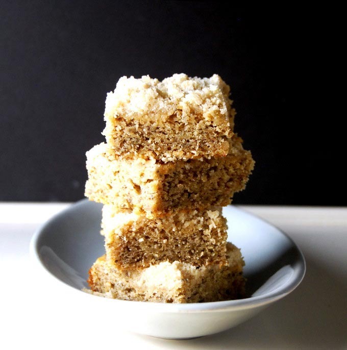 Zwischen dem Krümel, feuchtem Kuchen und herzhaftem Bananengeschmack wird Ihnen wahrscheinlich nicht einmal bemerken, dass dieser Vollkornkuchen vegan ist (Kokosnussöl, Appleauce und Bananen, die für Eiern putzen).