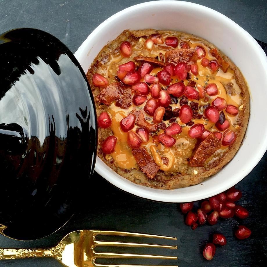 Fan des Brot-Puddings? Sie werden diese gesunde Wiedergabe lieben, die heiße Getreidepakete mit Chia, Amaranth und Quinoa (Superfood Trio), Mandelmilch und einen Hauch Zimt und Vanille für ein pflanzliches Machtmehl kombinieren. Sie können etwas Nussbutter für eine Dosis gesunden Fette hinzufügen und in Uber-nahrhaften Granatapfelsamen für einen Pop von Faser und Antioxidantien wirbeln.