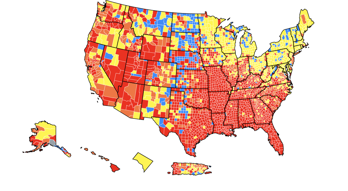 Irgendwo in rotem hier gilt als ein Gebiet der "hohen Übertragung"; Anywhere Orange gilt als "wesentlich"