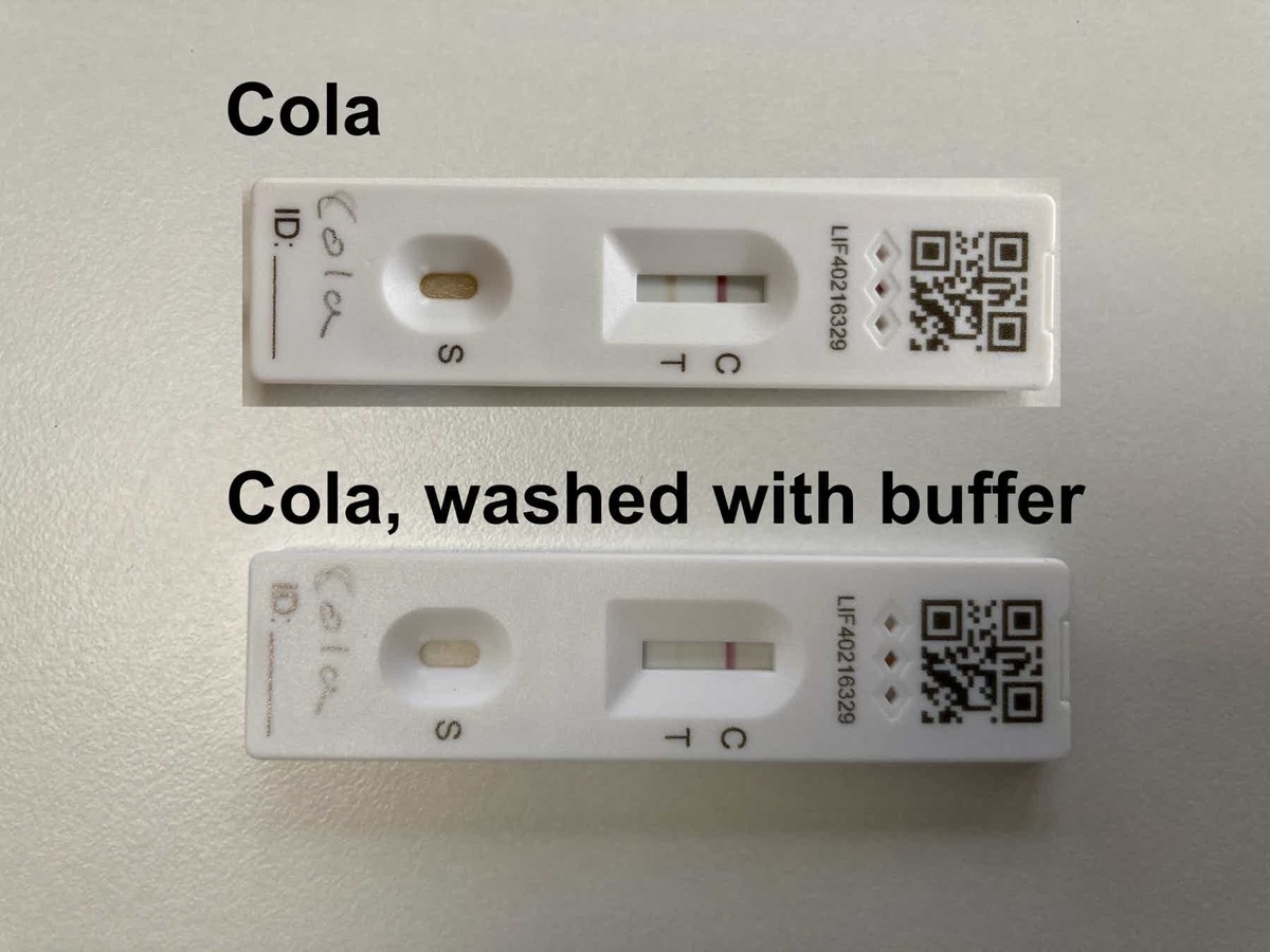 In Anbetracht dessen, dass die sauren Getränke zu völlig leeren Tests führen würden. Denaturierte Proteine sind jedoch klebrige Tiere. Alle diese perfekt entwickelten Wechselwirkungen, die das Protein normalerweise zusammenhalten würden, sind jetzt verwaist und suchten nach etwas, an das sie binden können. Eine wahrscheinliche Erklärung ist also, dass die immobilisierten Antikörper am T-Line direkt an den Goldpartikeln an den Goldpartikeln stecken, während sie vorbeifahren, wodurch das berüchtigte Cola-induzierte falsch positive Ergebnis erzeugt wird.