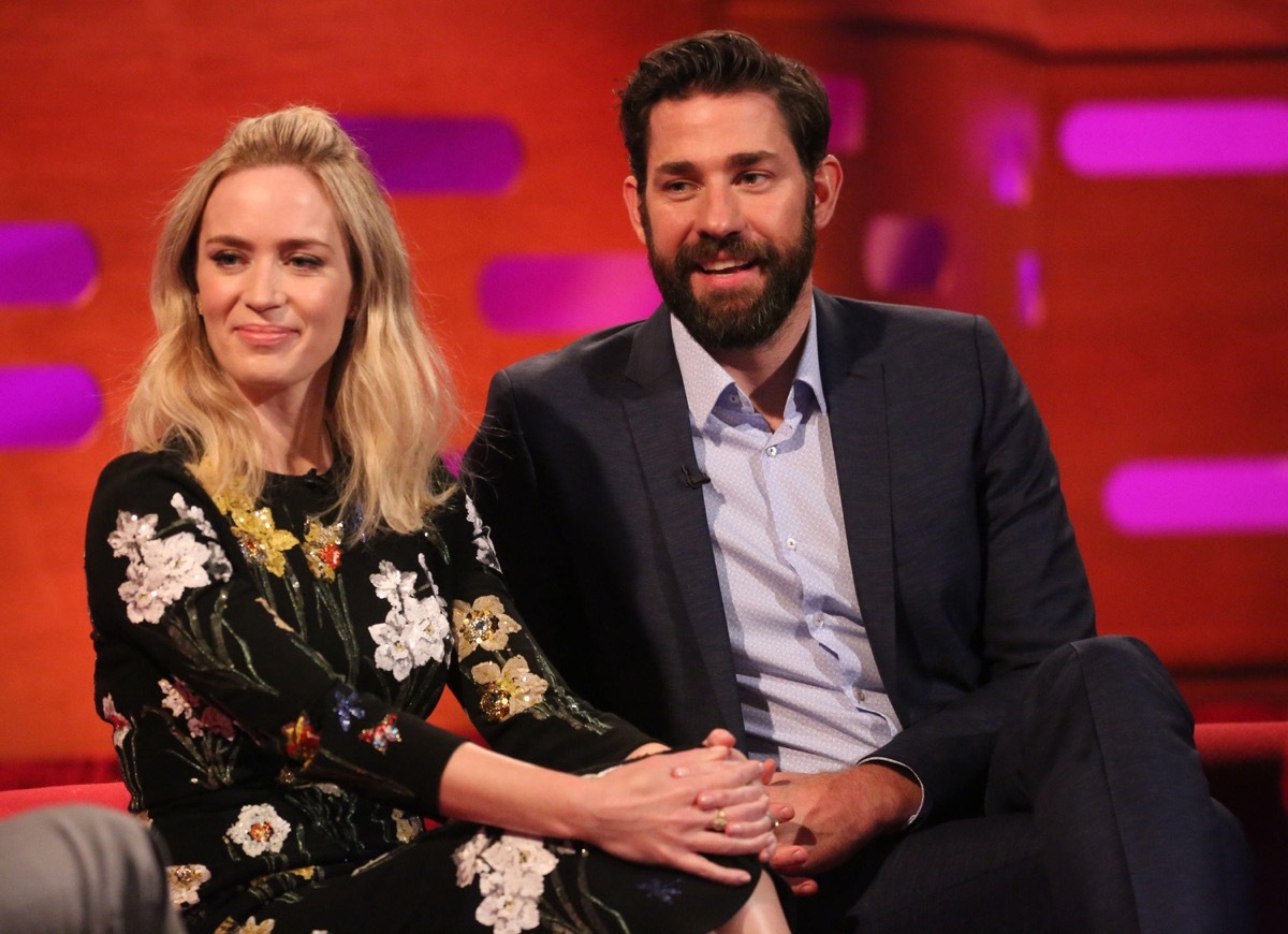 John Krasinski nimmt den lustigen Jab in Hugh Jackman, um sich mit Emily Blunt zusammenzusetzen