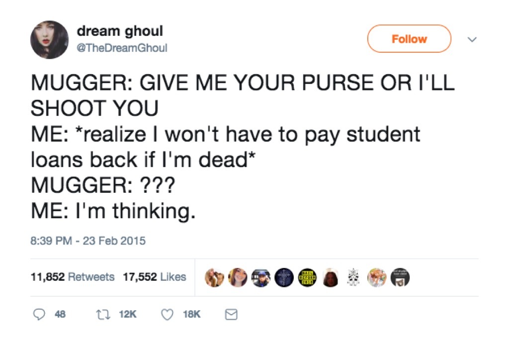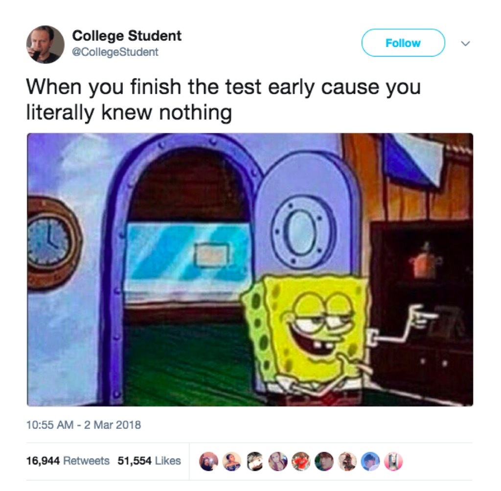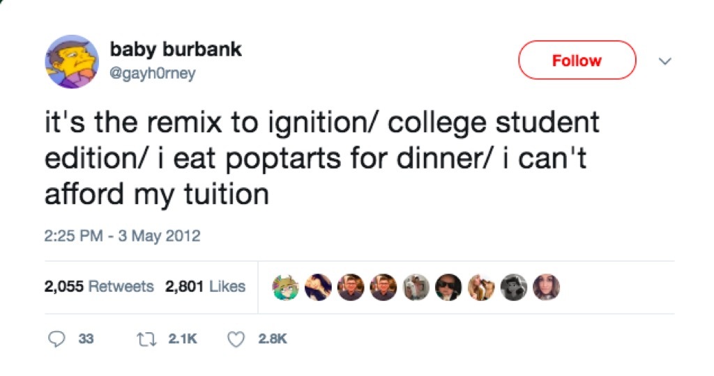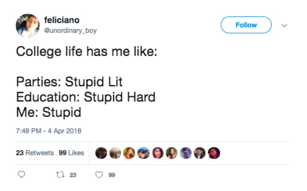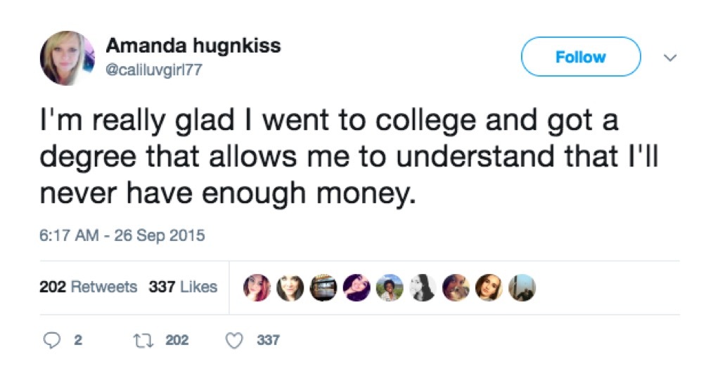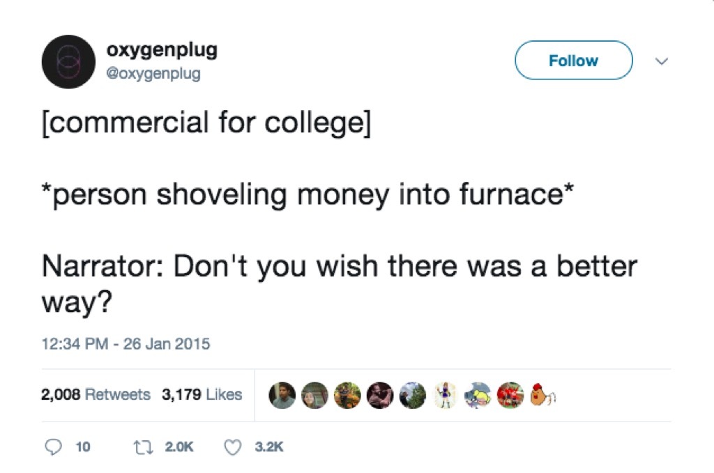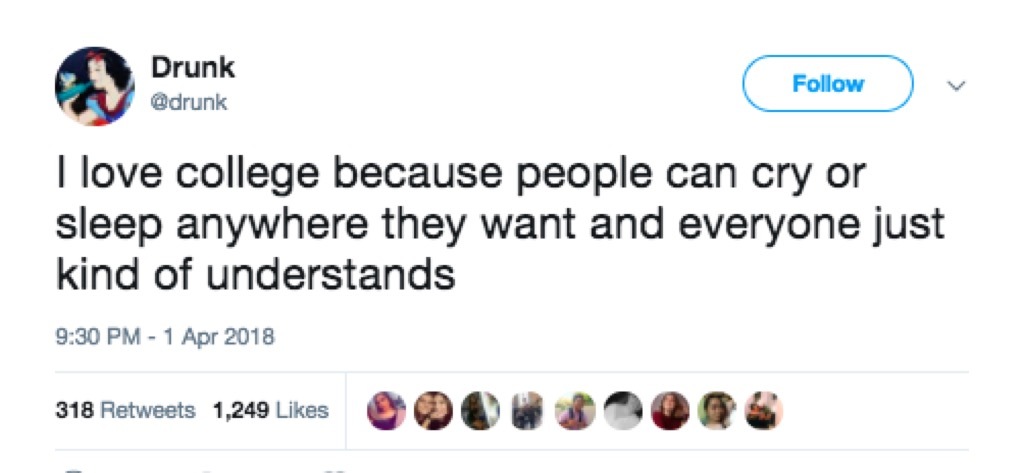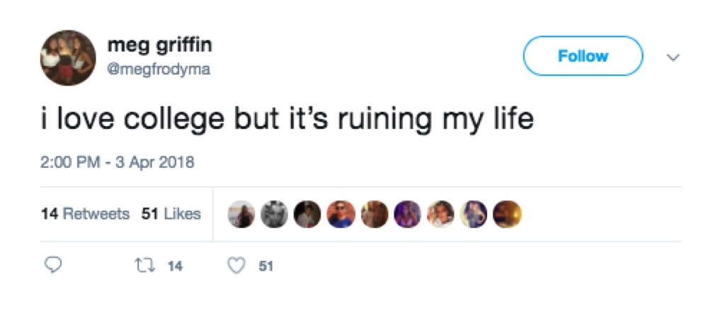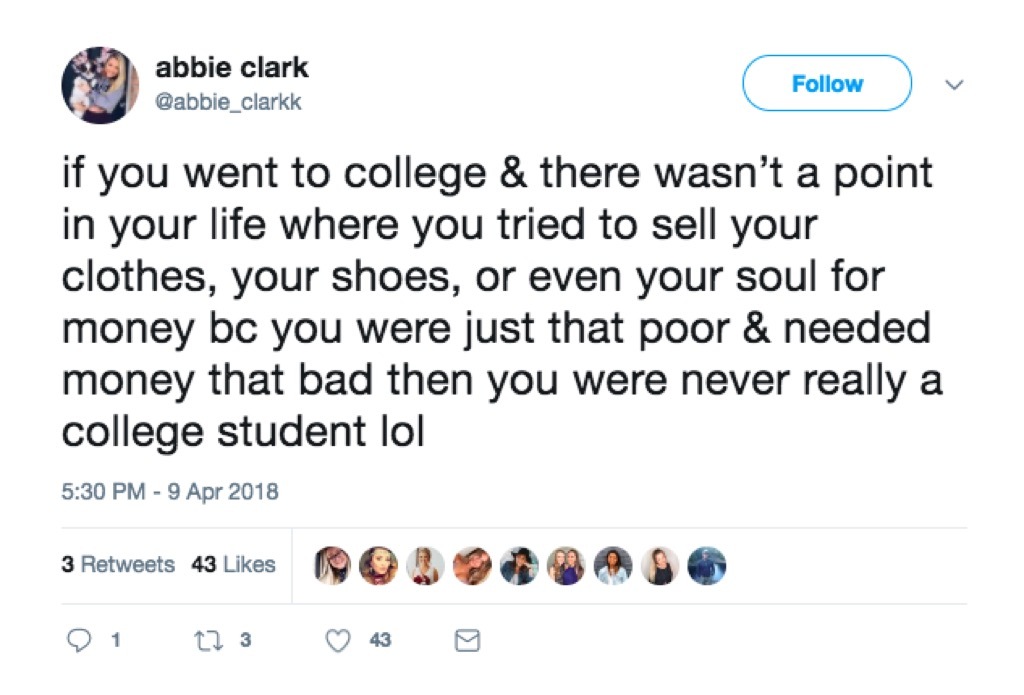 Es sind jedoch nicht alle Parteien und die Suche nach den billigsten gebrauchten Lehrbüchern. Es gibt viel Platz für die Leuchtendheit, besonders wenn Sie ein College-Student sind, der bereit ist, einen Witz auf eigene Kosten zu knacken (ob der Aufwand, einen Mahlzeiten ist, einen Mahlzeiten, oder eine Darlehensrückzahlung ist eine andere Geschichte). Eine Sache ist sicher: Wenn Sie an der College waren, finden Sie diese Tweets, die schmerzhaft umliebbar sind. Für mehr Seitenaufspaltung lachen Sie heraus50 Erstaunliche Witze, die Sie Ihre Freunde schreiben können.