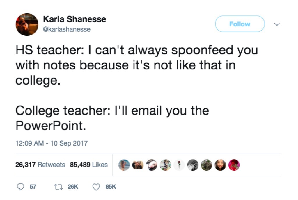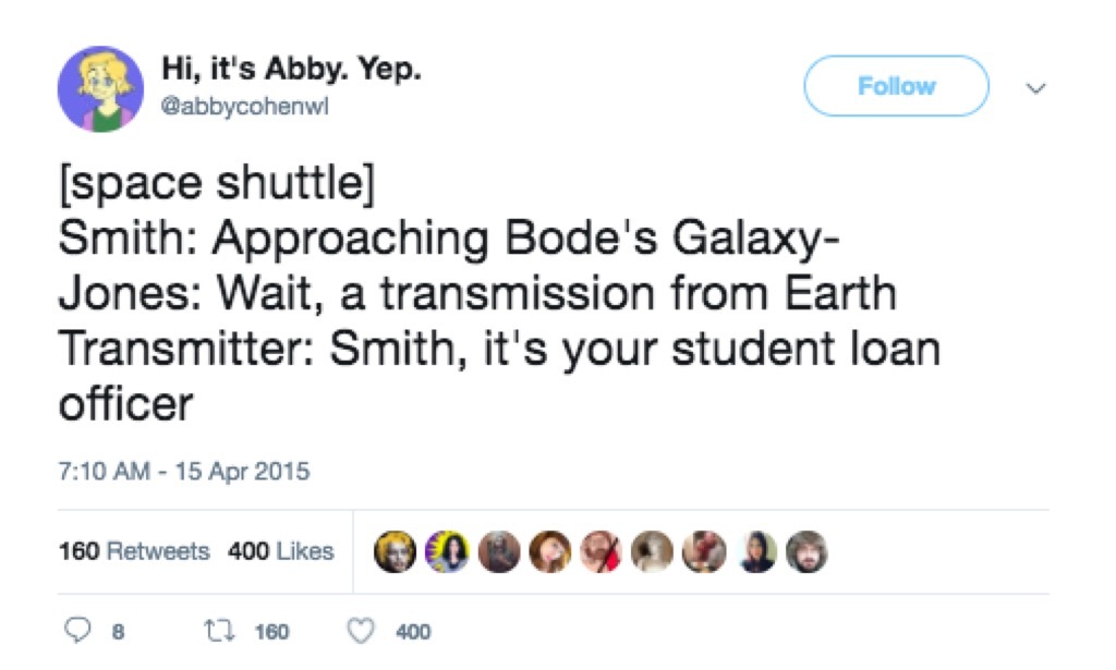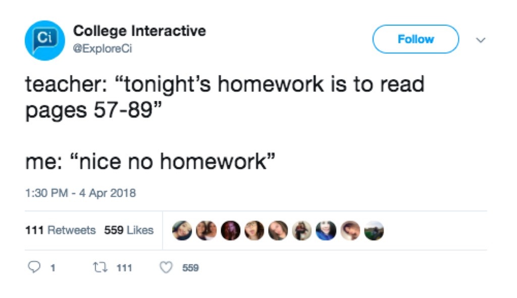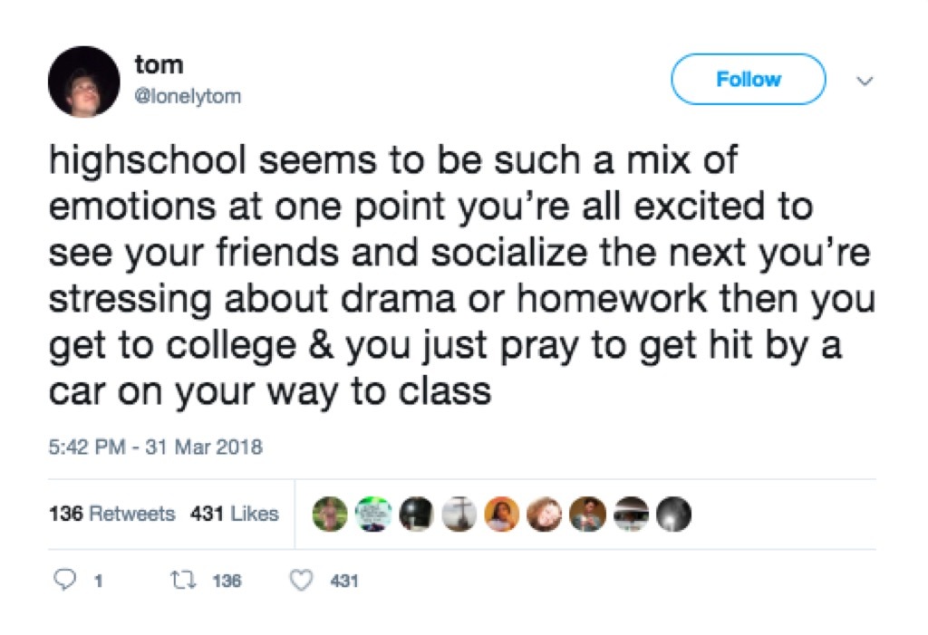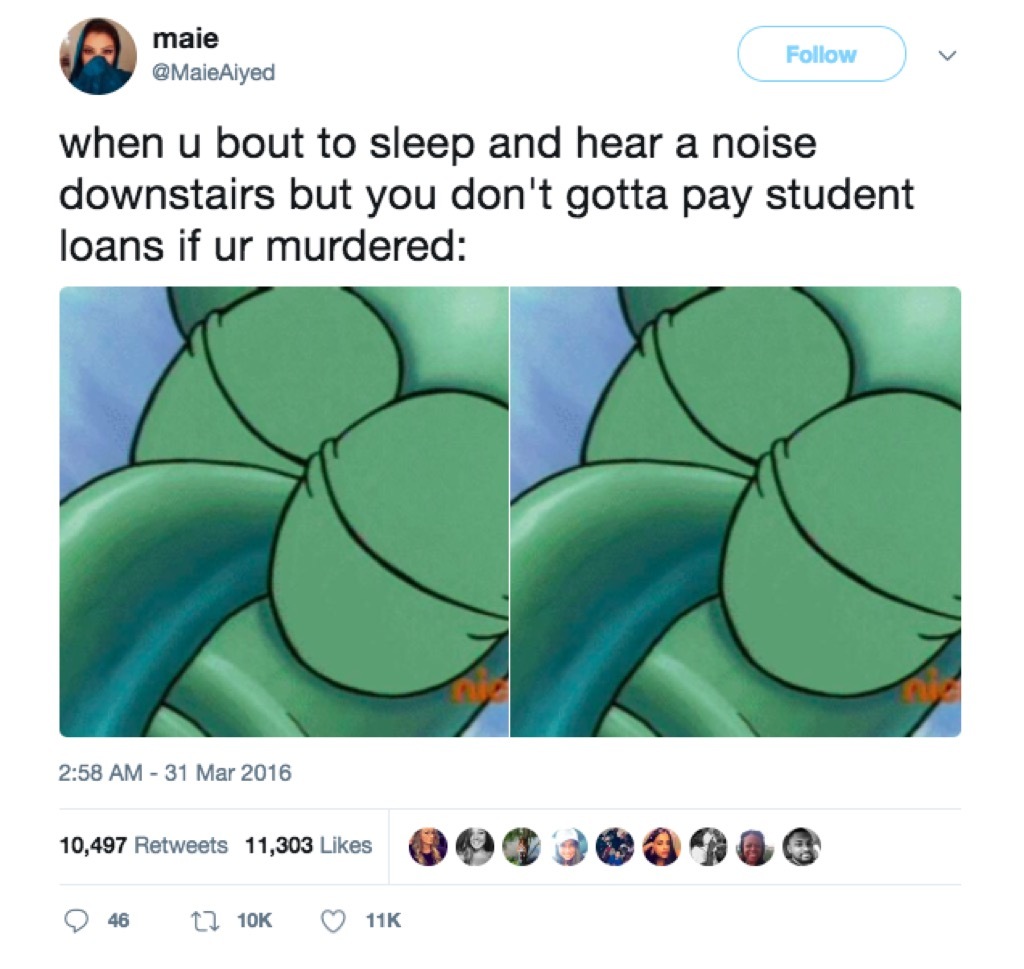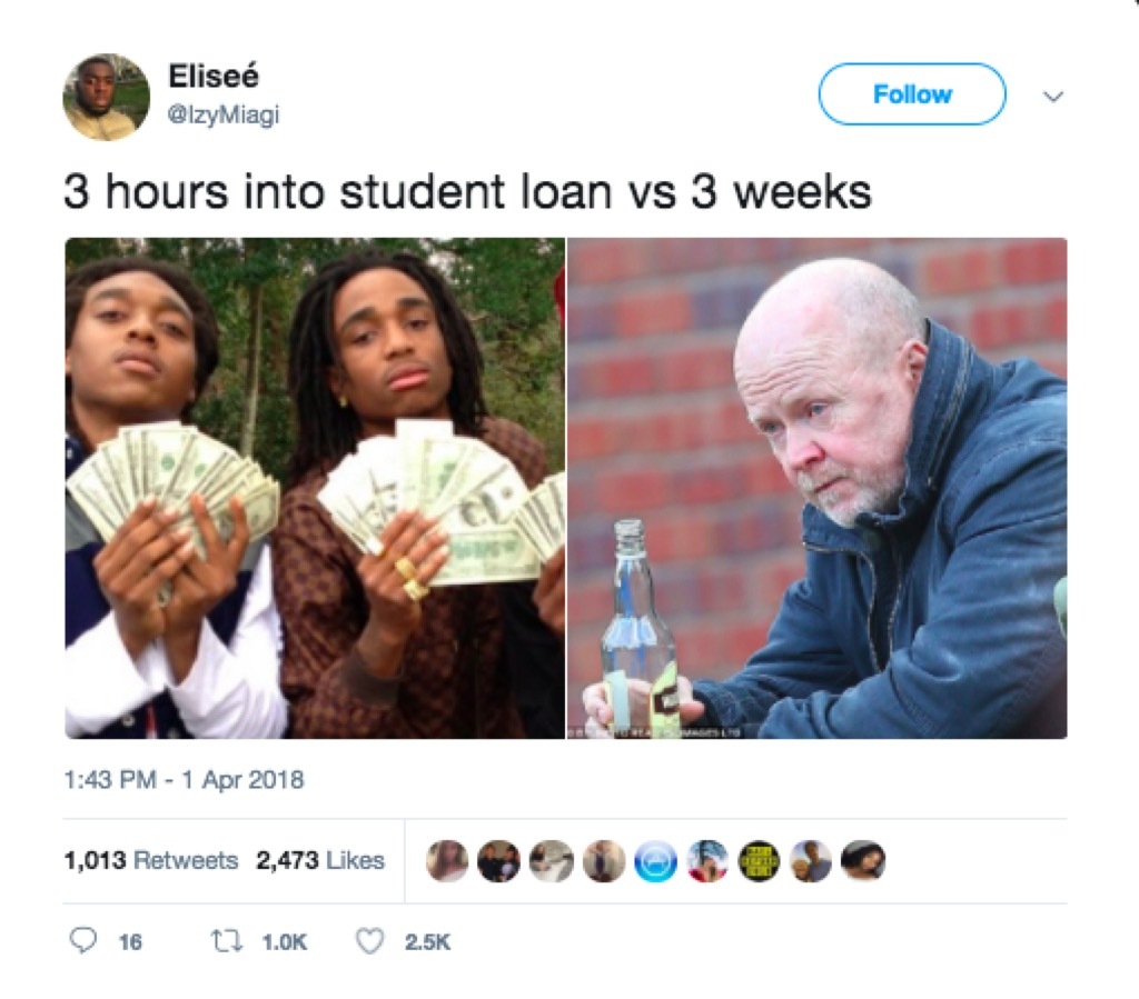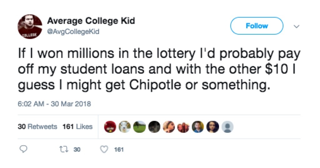 Es sind jedoch nicht alle Parteien und die Suche nach den billigsten gebrauchten Lehrbüchern. Es gibt viel Platz für die Leuchtendheit, besonders wenn Sie ein College-Student sind, der bereit ist, einen Witz auf eigene Kosten zu knacken (ob der Aufwand, einen Mahlzeiten ist, einen Mahlzeiten, oder eine Darlehensrückzahlung ist eine andere Geschichte). Eine Sache ist sicher: Wenn Sie an der College waren, finden Sie diese Tweets, die schmerzhaft umliebbar sind. Für mehr Seitenaufspaltung lachen Sie heraus50 Erstaunliche Witze, die Sie Ihre Freunde schreiben können.