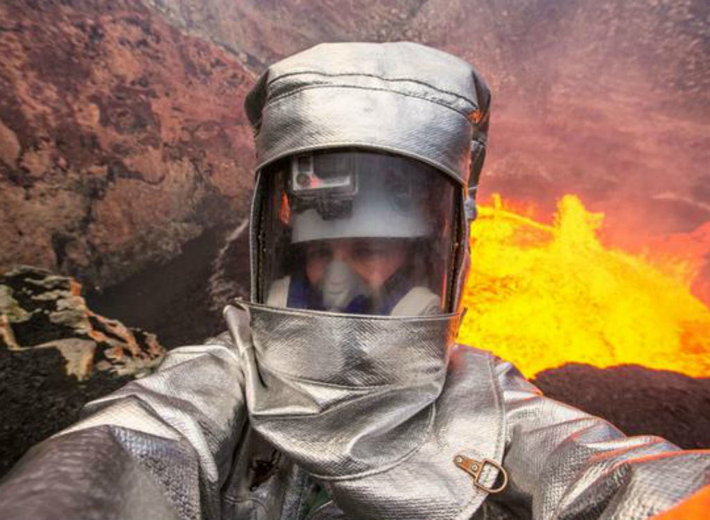 Nationale Geographie ForscherGeorge Koourounis. beschlossen, einen Moment vor einem aktiven Vulkan zu nehmen, um ein Bild von sich selbst zu machen.