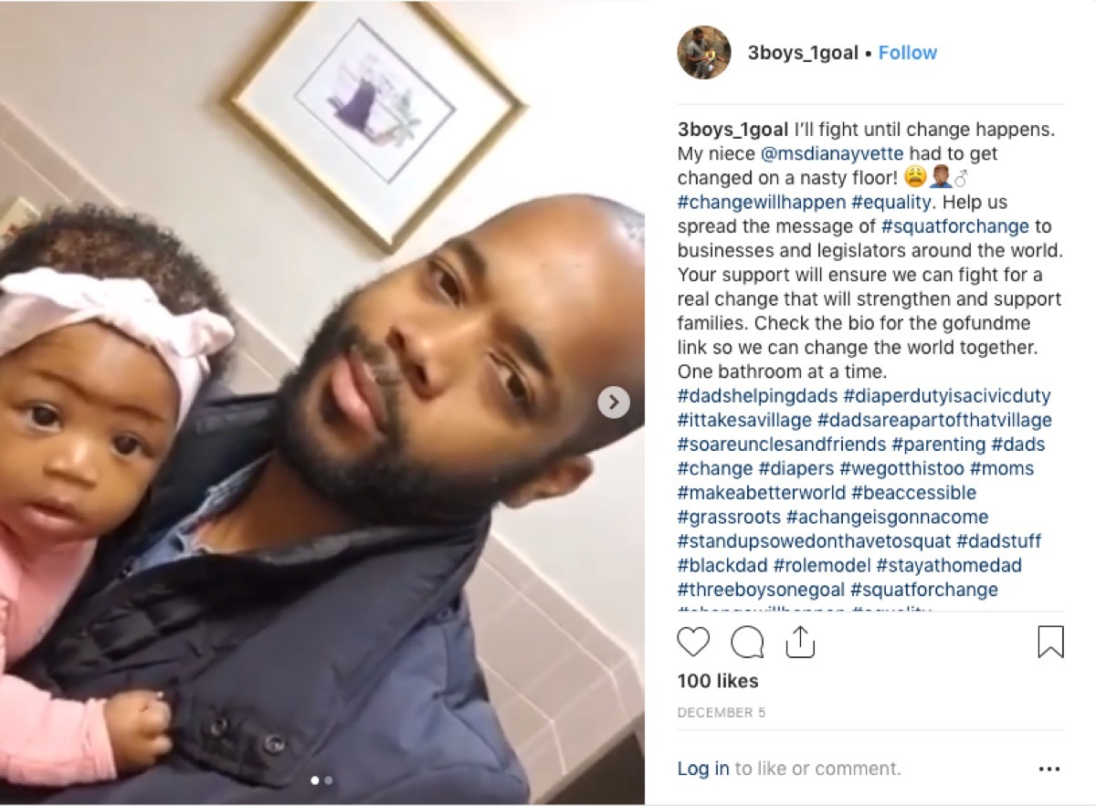 Trotz vieler Fortschritte werden Mütter oft noch angenommen, dass sie die Hauptpflegerinnen für die heutigen Kinder sind. Donte Palmer, ein 31-jähriger Vater von St. Augustine, Florida, will das ändern. Sein Viralfoto von dem, was er einen "tiefen Mann-Squat" nennt, mit seinem einjährigen Sohn, der für einen Windelwechsel über seinen Schoß führte, zeigte die Notwendigkeit, dass in den Toiletten der öffentlichen Herren die Notwendigkeit mehr windelorientierter Tische auftauchten.