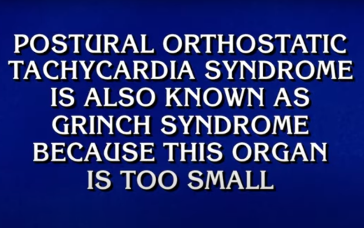 Die fragliche Erklärung war Teil einer Kategorie, die während der MONDAY-Episode "Plain-Named-Malradys" namens "Plain-Named-Malradies" genannt wurde, die von Gast gehostet wurdeSavannah Guthrie.. Der Hinweis lautet: "Das postural-orthostatische Tachykardien-Syndrom ist auch als Grinch-Syndrom bekannt, da dieses Organ zu klein ist." Die Antwort, nach der sie suchten, war: "Was ist das Herz?"