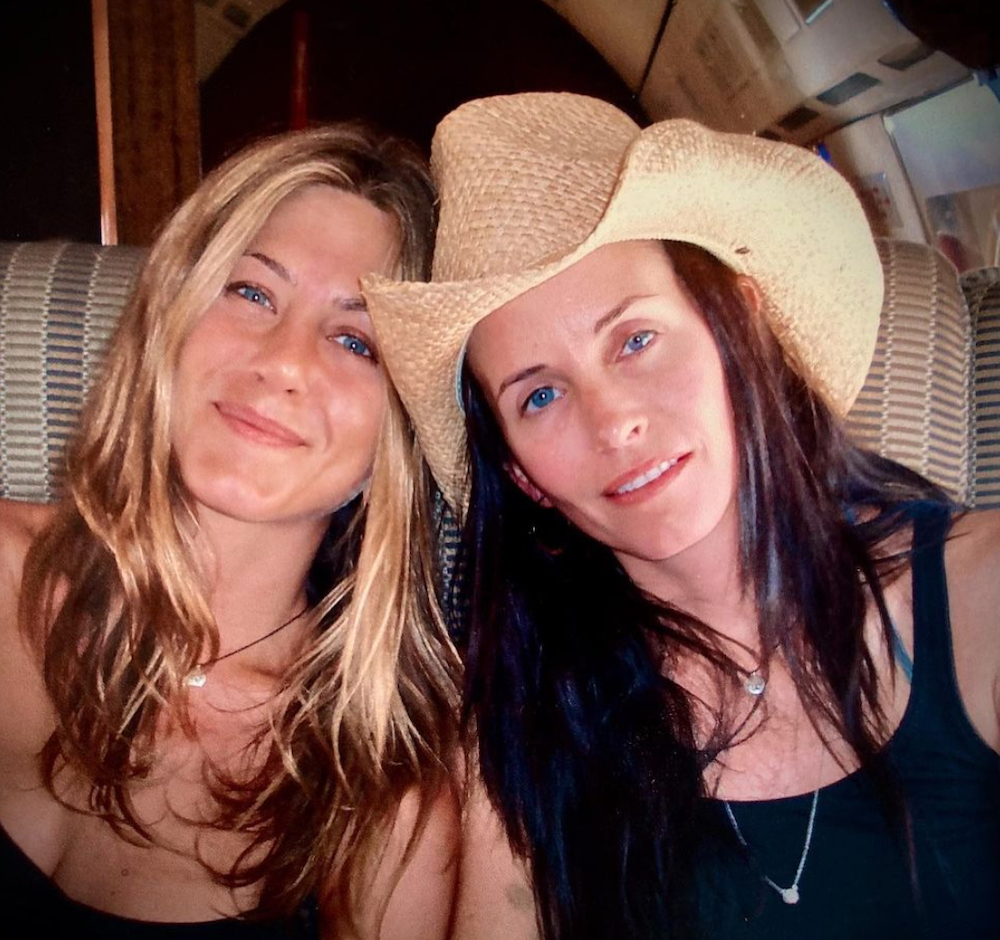 Zusammen mit ihrer Geburtstagsnachricht brachte Cox ein Foto von sich selbst und Aniston mit ihrer jetzt 16-jährigen Tochter Coco, als sie viel jünger war. Cox teilte auch ein zweites Foto, in dem sie und Aniston in einem Flugzeug mit einem großen Strohhut trug.