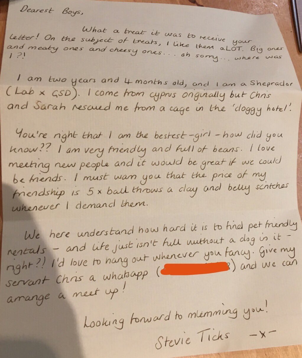Stevie schrieb, dass es ein "Treat" war, um ihren Brief zu erhalten - und natürlich kennt sie ein oder zwei Dinge darüberVergnügungen. Sie erklärte, dass sie ein istLabrador und Deutscher Shepherd-Mix Wer ist zweieinhalb Jahre alt und wurde von ihrem Menschen, Chris und Sarah gerettet. Sie sagte auch, sie würde es lieben, ihr Freund zu sein.