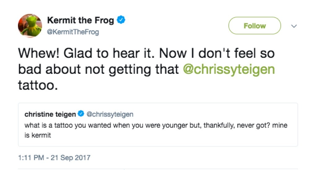 Komm nicht für Kermit und erwartenicht entkommen. Und um mehr von der Markenzeichen des Supermodels zu überprüfen, checken Sie herausChrissy Teiigans 30 lustigste soziale Momente.
