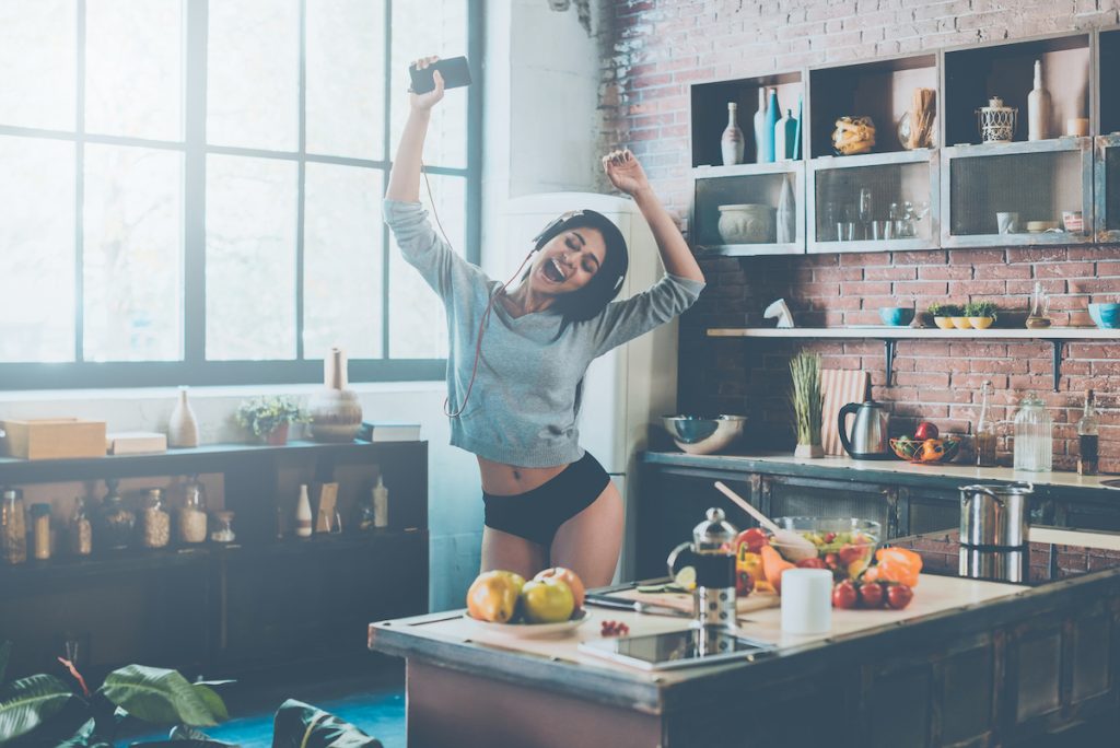 Wenn Sie nicht wirklich in Zumba-Kursen sind, können Sie immer nur in Ihrem eigenen Zuhause mit Ihrer Lieblings-Playliste herum tanzen. Nur 20 Minuten, was um 5 Songs ist, und Sie haben 100 Kalorien verbrannt, während Sie sich auf Ihre Lieblings-Melodien herausragen. Erinnern Sie sich einfach daran, dass sich niemand auf einen maximalen Stimmungsschub beobachtet.