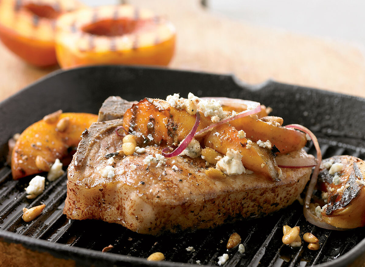 Gewürzen Sie Ihre Schweinekoteletts mit gegrilltem Pfirsichen