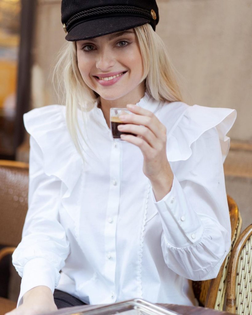 Die Verbindung all dieser Schönheitselemente wird durch einen schicken lässigen Look ergänzt. Es trägt Schwarzweiß, Jeans mit weißen T-Shirts oder blühenden Kleidern. Von Zeit zu Zeit trägt es Pastellfarben oder gemustere Kleidung. Es hat es auch mehrmals gesehen, was ein schwarzes Barett trägt.Fotos aus Instagram: @areliepons_