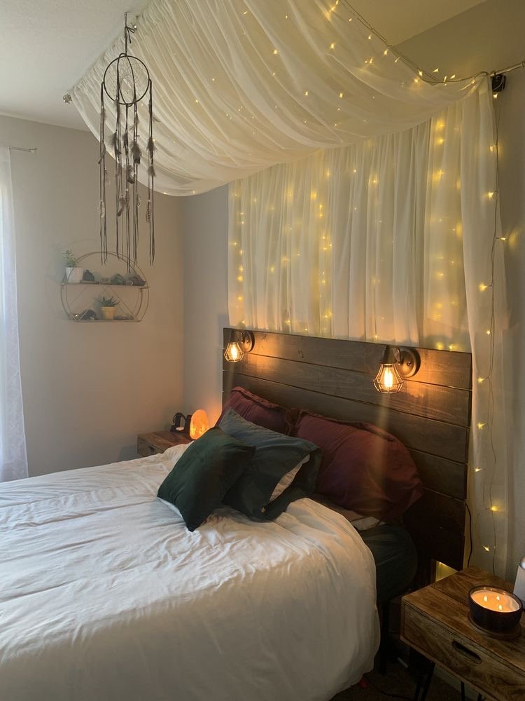 Machen Sie die Atmosphäre in Ihrem Schlafzimmer romantischer, um das Garland-Kopfteil oder die Wand, dahinter, zu gestalten. Auf diese Weise können Sie auch die elegante Kontur des Kamins oder ein lockiges Kabinett betonen.