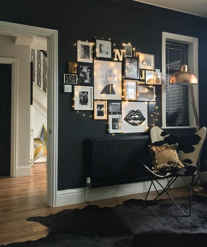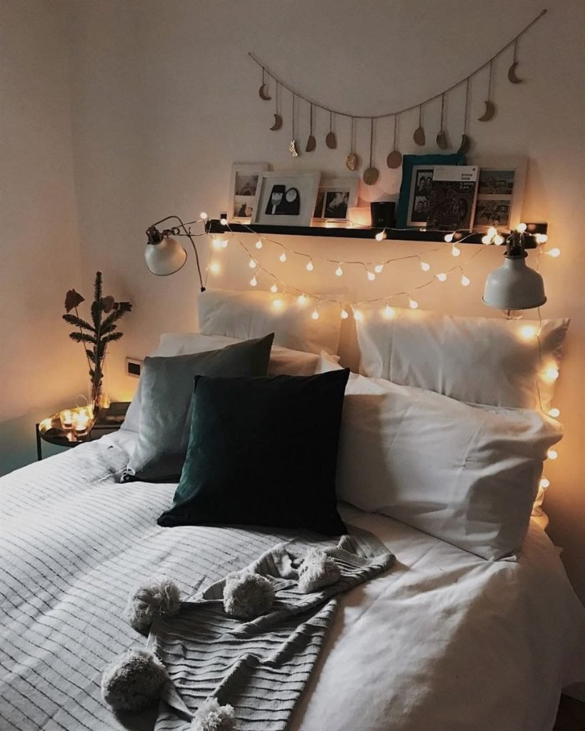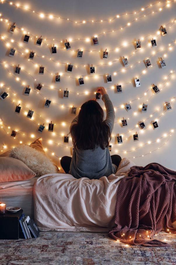 Drucken Sie Ihre Lieblingsbilder und platzieren Sie sie in die Girlande. Es ist besser, eine spezielle Girlande mit einem transparenten Draht- und Wäscheklammern zu erwerben. Eine andere Möglichkeit besteht darin, Bilder in den Rahmen an der Wand zu platzieren, wobei der Faden der Girlanden ihrer Konturen unterstreicht wird.